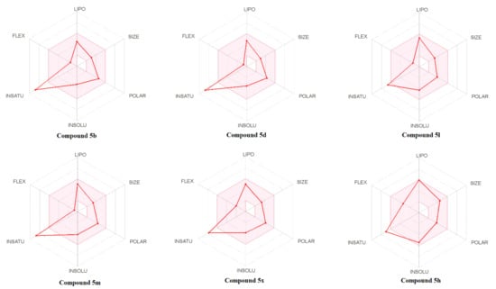 Bioavailability radar of the tested compounds. The pink area represents the optimal range for each property for oral bioavailability, (lipophilicity (LIPO): XLOGP3 between −0.7 and +5.0, molecular weight (SIZE): MW between 150 and 500 g/mol, polarity (POLAR): TPSA between 20 and 130 Å2, solubility (INSOLU): log S not higher than 6, saturation (INSATU): fraction of carbons in the sp3 hybridization not less than 0.25, and flexibility (FLEX): no more than 9 rotatable bonds).
