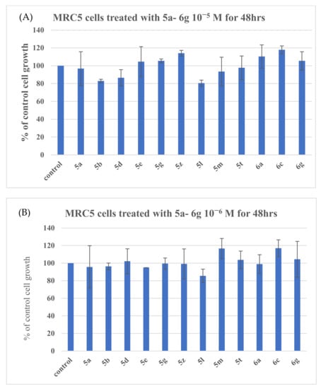 Assessment of cell proliferation of MRC-5 cells exposed to different compounds in culture. MRC-5 cells grown in culture were separately incubated with each of the compounds at concentrations 1 × 10−5 M (10 μΜ) (panel A) and 1 × 10−6 M (1 μM) (panel B) for 48 h [44].