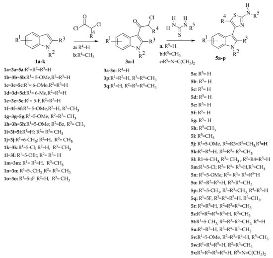 The title compounds were synthesized according to Scheme 1. Substituted 3-(α-chlorouracil) indoles (3a–l) obtained by acylation of the corresponding indoles (1a–k) with chloroacetic (2a) and α-chloropropionic acid chlorides (2b) were used as starting compounds for their synthesis. 3-(α-chlorouracil) indoles (3a–l), upon heating in methanol with thiourea (4a) and its derivatives (4b), in the presence of a base, were converted into the target 4- (indol-3-yl)thiazole-2-amines (5a–o) (Scheme 1). Compounds of both groups were obtained good yields in a range of 49–71% for indole-based thiazole derivatives and 49–77% for methylindole thiazole derivatives.