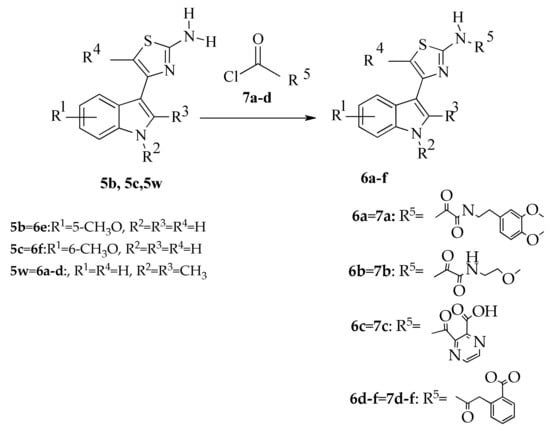 For the synthesis of 4-(indol-3-yl)thiazol-2-amines (6a–f) containing an acyl residue in the amino group, 4- (indol-3-yl) thiazol-2-amines (5b, 5c, 5w) were treated with acid chlorides of the corresponding acids (7a–d) in pyridine (Scheme 2).
