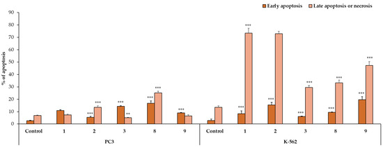 The effect of compounds 1–3, 8, and 9 on early and late apoptosis in PC3 and K-562 cells. Cells were incubated for 72 h with the tested compounds used in their IC50 concentrations, then cells were harvested, stained with Annexin V-FITC and PI, and analyzed using flow cytometry. Data are expressed as % of cells in the early stage of apoptosis, and as % of cells in the late stage of apoptosis. Data are expressed as the means ± SD. *** p ≤ 0.001, * p ≤ 0.05, as compared to the control.