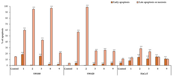 The effect of compounds 1–3, 8, and 9 on early and late apoptosis in SW480, SW620, and HaCaT cells. Cells were incubated for 72 h with the tested compounds used in their IC50 concentrations, then cells were harvested, stained with Annexin V-FITC and PI, and analyzed using flow cytometry. Data are expressed as % of cells in the early stage of apoptosis, and as % of cells in the late stage of apoptosis or necrosis. Data are expressed as the mean ± SD. *** p ≤ 0.001, ** p ≤ 0.01, as compared to the control.