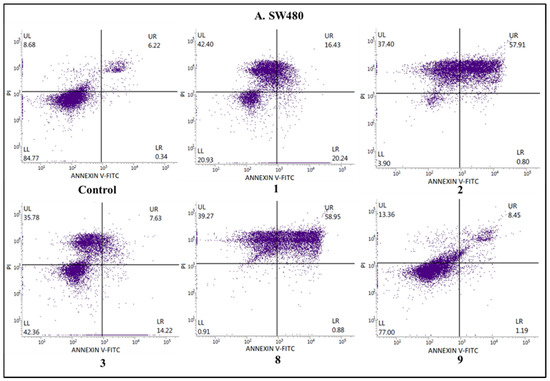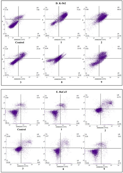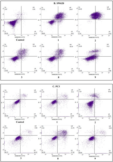 The cells were cultured and harvested under the conditions described in Section 3.2.1. Then, they were seeded in six-well plates (2 × 105 cells per well), and treated with the selected thioureas 1–3, 8, and 9 at their IC50 concentration for 72 h. The effect of these compounds on the process of early and late apoptosis and necrosis was determined as described previously [37] by dual staining with Annexin V:FITC and propidium iodide, according to the manufacturer’s protocol (Becton Dickinson). The cells that were Annexin V:FITC positive and PI negative were identified as early apoptotic, and Annexin V:FITC and PI positive as late apoptotic or necrotic.