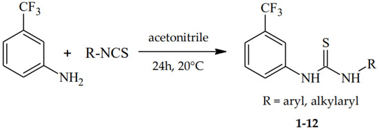 A solution of commercially available 3-(trifluoromethyl)aniline (00031 mol, 0.50 g) in anhydrous acetonitrile (5 mL) was treated with appropriate isothiocyanate (0.0031 mol) and the mixture was stirred at room temperature for 24 h. Then, solvent was removed on a rotary evaporator. The residue was purified by column chromatography (chloroform: methanol; 9.5:0.5 vol.) to yield derivatives 1–12.