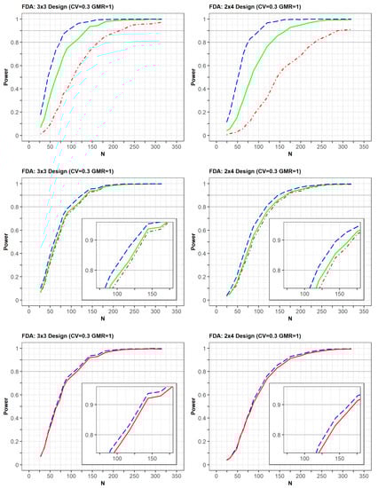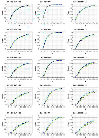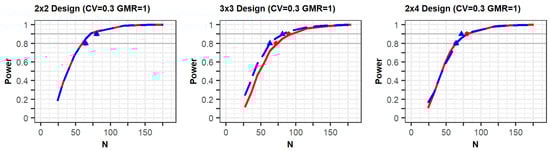 In the simulation results obtained as per the EMA guidelines, a similar increasing trend of power curves was observed in all the designs (2 × 2, 3 × 3, and 2 × 4) of the crossover studies. All designs were analyzed using a GLM according to the EMA guidelines. In detail, the statistical powers increased with a similar trend in the three crossover designs when the within-subject CV was 0.2 or 0.3. However, when the CV was 0.5 or 0.6, the powers were different among the three designs, with the power of the 2 × 2 design being the lowest. As the CV increased, more total number of observations (N) were needed to obtain the same power for the 3 × 3 and 2 × 4 designs. Specifically, large total number of observations (N) were required to attain 80% or 90% power at CV values of 0.5 or 0.6.