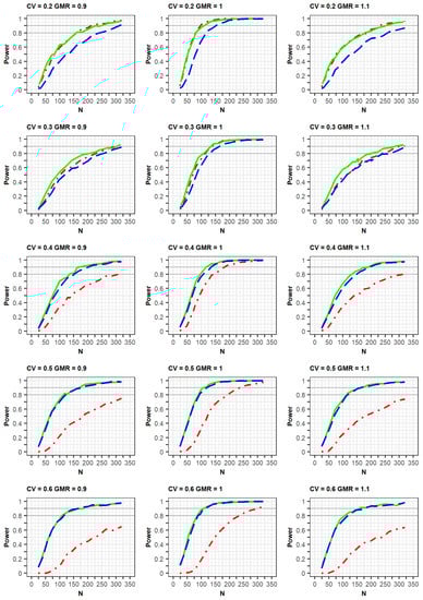 To compare the statistical power in all the study designs with various values of within-subject CVs, including the CV ≥ 0.3 for HVDs, a study design with a CV of 0.2, which is <0.3, was also simulated. When the CV was set to 0.3 for simulation, CV values > or <0.3 were generated (sampled) in simulation cases. These cases were reported as “borderline HVDs” in a previous study []. In other words, a borderline HVD is a compound whose CV can be estimated to be > or <0.3. Meanwhile, some drugs have been reported to have a CV > 0.3 in all bioequivalence studies, and these drugs are termed “consistent HVDs” []. These consistent HVDs were determined using a simulation in which the CV was set to 0.6. This simulation was confirmed by a CV > 0.3 for all datasets.