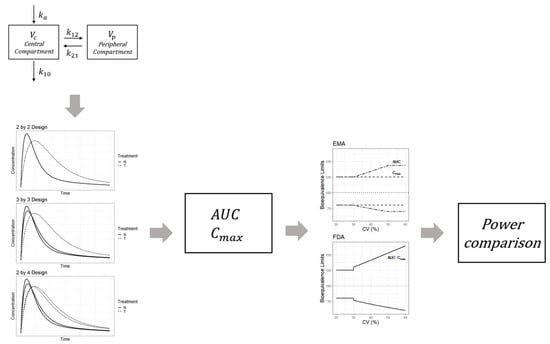 Based on the PK model with typical values and assumptions, individual values for Vc, Vp, CL, Q, Ka, and F were generated for each subject. The individual PK parameters were used to generate a time-concentration curve based on Equation (1). In Equation (1), D denotes the dose, k10 denotes the elimination rate constant from the central compartment, and k12 and k21 represent the transfer rate constant from the central compartment to the peripheral compartment and the transfer rate constant from the peripheral to the central compartment, respectively. Each simulation concentration was obtained according to the corresponding design of three clinical trial designs (2 × 2, 3 × 3, and 2 × 4). After determining the Cmax or AUC from simulated concentrations, bioequivalence between the two drugs was investigated by applying the bioequivalence test methods outlined by the EMA and FDA. Power was calculated as the rate of bioequivalence success and was compared between the trial designs.