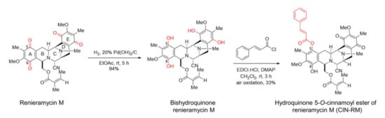 CIN-RM was prepared from remieramycin M based on the previously reported two-step chemical modification involving palladium catalyzed hydrogenation and esterification (Figure 1) []. Under this procedure, the quinone moieties on ring A and E of renieramycin M were reduced to the hydroxyl groups to become bistetrahydroquinone renieramycin M. Esterification occurred at the C-5 hydroxyl group only based upon the sterical hindrance to furnish hydroquinone monoester renieramycin M. Subsequent oxidation by air provided CIN-RM in an expectable yield (33%).