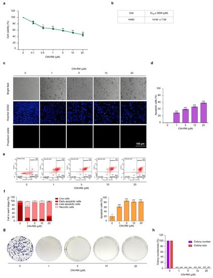 The anticancer activity of CIN-RM was indicated by (a) the significant reduction of % cell viability in human lung cancer H460 cells with CIN-RM at 0–20 μM for 24 h. (b) The half maximal inhibitory concentration (IC50) of CIN-RM in H460 cells was 14.64 ± 7.09 μM. (c) Apoptotic H460 cells were detected by Hoechst 33342/PI staining and visualized by fluorescence microscopy. (d) The percentage of apoptotic cells in CIN-RM-treated cells was analyzed. (e,f) Cells were treated with various concentrations of CIN-RM (0–20 μM) for 24 h, and apoptosis was evaluated by annexin V-FITC/PI staining. (g,h) Cells were treated with various concentrations of CIN-RN (0–20 µM) for 24 h before being subjected to forming colonies for 7 days, then the colonies were stained with crystal violet. All data are presented as the mean ± SEM (n = 3). * p < 0.05, ** p < 0.01, and *** p < 0.001 compared with untreated cells.