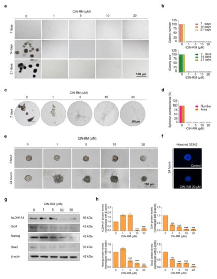 It is widely accepted that CSCs can escape apoptosis in response to chemotherapy. Next, we tested whether CIN-RM had this effect on a resistant cell population in the modified colony formation assay. Surviving H460 cells after a 24 h CIN-RM (1, 5, 10, and 20 μM) treatment were subjected to a clonogenic assay without further treatment. Crystal violet-stained colonies representing the capability to reproduce a new cancer colony from a single cell were shown in Figure 2g,h. It was shown that the resistant cells receiving CIN-RM at 1–20 µM could not form the colonies (Figure 2g,h).