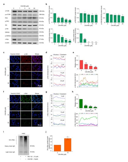 Effect of CIN-RM on Akt/c-Myc signaling pathway. (a) H460 cells were treated with various concentrations (0–20 µM) of CIN-RM for 24 h and the expression levels of mTOR, p-mTOR, PKC, p-PKC, GSK3β, p-GSK3β, Akt, p-Akt, and c-Myc protein were investigated by Western blotting. (b) Blots were reprobed with β-actin to confirm equal loading of samples. The immunoblot signals were quantified by densitometry. (c,f) H460 cells were treated with CIN-RN at toxic concentrations for 12 h. The cellular levels of p-Akt and c-Myc were determined by immunofluorescence analysis. (d,g) The fluorescence intensity of the nucleus and cytoplasm were analyzed by ImageJ software. (e,h) The fluorescence intensity was analyzed by ImageJ software. (i) H460 cells were treated with 10 µM MG132 for 1 h followed by 10 µM CIN-RM for 3 h. The specific c-Myc protein was immunoprecipitated using an antibody against c-Myc. The immunocomplex was evaluated by immunoblotting using ubiquitin antibodies. (j) Densitometry of Ub-c-Myc protein complex level was calculated. Values are presented as means ± SEM (n = 3). * p < 0.05, ** p < 0.01, and *** p < 0.001 compared with untreated cells.