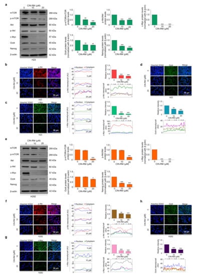 To confirm the effect of CIN-RM suppressing CSCs through the Akt/c-Myc signaling pathway on other lung cancer cells, H23 and H292 cells were treated with various concentrations of CIN-RM (0, 10, and 20 μM) and investigated for key regulatory proteins by Western blot analysis. The results indicated that the expression of p-Akt, p-mTOR, c-Myc, Oct4, and Nanog significantly decreased in response to CIN-RM compared with untreated control cells in both cells (Figure 6a,e), indicating that the CSC-suppressive activity of the CIN-RM on Akt/c-Myc is not cell type-specific. We further confirmed the inhibitory effect of CIN-RM on the Akt/c-Myc pathway using an immunofluorescence staining assay. H23 and H292 cells were treated with 0, 10, and 20 μM of CIN-RM for 12 h. Overall, p-Akt, c-Myc, and Oct4 fluorescence intensity significantly decreased in the CIN-RM treated cells (Figure 6b–d,f–h).