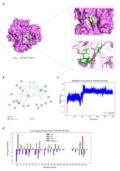 Docked model depicting the interaction of CIN-RM with the Akt protein. (a) Binding mode and docking energy of CIN-RM bound to the binding site of Akt taken from the MD study. (b) 2-dimensional (2D) of the interaction detail between CIN-RM and Akt. (c) The RMSD plot for the interaction of the CIN-RM/Akt complex during 300 ns of molecular dynamic simulation. (d) Total energy decomposition of the CIN-RM/Akt complex using the gmx_MMPBSA program.