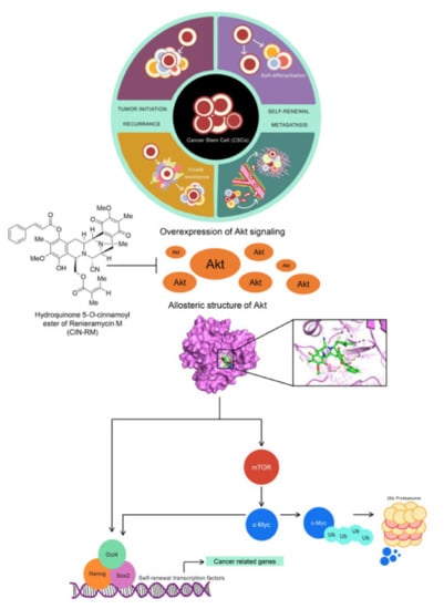 The proposed regulatory pathway is involved in the CSC suppression of CIN-RM. CSCs are the major cause of therapeutic failure due to their ability to self-renew and tumor initiation. They take part in cancer recurrence and metastasis. Akt signaling and related pathways are upregulated in CSCs leading to cancer aggressiveness. CIN-RM could directly interact and inhibit Akt function, resulting in the reduction of stem cell transcription factors. In addition, the inhibition of Akt triggers c-Myc proteasomal degradation. In the absence of upstream pluripotency factors Nanog, Oct4, and Sox2 and the protein co-factor c-Myc, the CSCs were depleted.