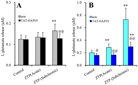 Effects of selective Cx43 inhibitor, N-terminal transactivator of transcription GAP19 (TAT-GAP19) (10 μM) on stimulatory effects of supratherapeutic concentration of ZTP (1000 nM) on basal (A) and HK-ACSF-evoked (B) astroglial L-glutamate releases. Ordinate: mean ± SD (n = 6) of astroglial L-glutamate release (μM). Light and dark colour columns indicate the incubation without (non) and with TAT-GAP19, respectively. ** p < 0.01: relative to non, @ p < 0.05, @@ p < 0.01 relative to control by MANOVA with Tukey’s (wholly significant difference) post-hoc test.