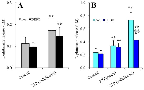 Concentration-dependent effects of acute and subchronic administrations of ZTP on basal astroglial L-glutamate release levels were analysed by multivariate analysis of variance (MANOVA) using BellCurve for Excel ver. 3.2 (Social Survey Research Information Co., Ltd., Tokyo, Japan). When the data did not violate the assumption of sphericity (p > 0.05), the F-value of the MANOVA was analysed, using sphericity-assumed degrees of freedom [78]. However, if the assumption of sphericity was violated (p < 0.05), the F-value was analysed, using Chi-Muller’s corrected degrees of freedom. When the F-value of MANOVA was significant, the data were analysed by a Tukey’s (wholly significant difference) multiple comparison test. Effects of chronic administration of a therapeutically relevant concentration of ZTP (300 nM) on astroglial L-glutamate release was analysed by Student’s T-test.