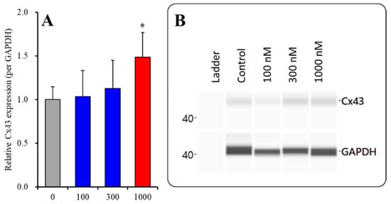 The capillary immunoblotting analysis was performed, using Wes (ProteinSimple, Santa Clara, CA, USA), according to the ProteinSimple user manual. The lysates of the primary cultured astrocytes were mixed with a master mix (ProteinSimple) to a final concentration of 1× sample buffer, 1× fluorescent molecular weight marker, and 40 mM dithiothreitol and then heated at 95 °C for 5 min. The samples, blocking reagents, primary antibodies, HRP-conjugated secondary antibodies, chemiluminescent substrate (SuperSignal West Femto: Thermo Fisher Scientific, Waltham, MA, USA), and separation and stacking matrices were also dispensed to the designated wells in a 25-well plate. After plate loading, the separation electrophoresis and immunodetection steps took place in the capillary system and were fully automated. A capillary immunoblotting analysis was carried out at room temperature, and the instrument’s default settings were used. Capillaries were first filled with a separation matrix followed by a stacking matrix, with about 40 nL of the sample used for loading. During electrophoresis, the proteins were separated by molecular weight through the stacking and separation matrices at 250 volts for 40–50 min and then immobilized on the capillary wall, using proprietary photoactivated capture chemistry. The matrices were then washed out. The capillaries were next incubated with a blocking reagent for 15 min, and the target proteins were immunoprobed with primary antibodies followed by HRP-conjugated secondary antibodies (Anti-Rabbit IgG HRP, A00098, 10 μg/mL, GenScript, Piscataway, NJ, USA). The antibodies of GAPDH (NB300-322, 1:100, Novus Biologicals, Littleton, CO, USA) and Cx43 (C6219, 1:100, Sigma-Aldrich, St. Louis, MO, USA) were diluted in an antibody diluent (ProteinSimple) [66].