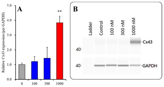 Concentration-dependent effects of subchronic administration of ZTP on Cx43 protein expression in the plasma membrane fraction (A) and their pseudogel images, using capillary immunoblotting (B). Ordinate: mean ± SD (n = 6) of the relative protein level of Cx43 (per GAPDH). Concentration-dependent effects of ZTP (100, 300 and 1000 nM) on Cx43 expression in the plasma membrane fraction of the primary cultured astrocytes were analysed by one-way ANOVA with Tukey’s (wholly significant difference) post hoc test (** p < 0.01 vs. ZTP free (0)).