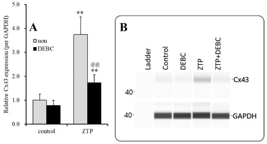 Interaction between subchronic administration of supratherapeutic concentration of ZTP and Akt inhibitor (DEBC) on Cx43 protein expression in the astroglial plasma membrane fraction (A) and their pseudogel images, using capillary immunoblotting (B). Ordinate: mean ± SD (n = 6) of the relative protein level of Cx43 (per GAPDH). Effects of ZTP (1000 nM) and Akt inhibitor (DEBC: 10 μM) on Cx43 expression in the plasma membrane fraction of the primary cultured astrocytes were analysed by two-way ANOVA with Tukey’s (wholly significant difference) post hoc test (** p < 0.01 vs. control, @@ p < 0.01 vs. non).