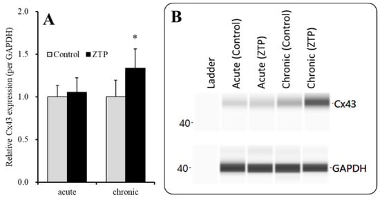 Effects of acute (120 min) administration of supratherapeutic concentration of ZTP (1000 nM) and chronic (14 days) administration of therapeutically relevant concentrations of ZTP (300 nM) on Cx43 protein expression in the plasma membrane fraction (A) and their pseudogel images, using capillary immunoblotting (B). Ordinate: mean ± SD (n = 6) of the relative protein level of Cx43 (per GAPDH). Effects of ZTP on Cx43 expression in the plasma membrane fraction of the primary cultured astrocytes were analysed by student T-test (* p < 0.05 vs. control: ZTP free).