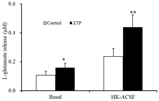 Effects of the chronic administrations of therapeutically relevant concentration of ZTP (300 nM) on basal and HK-ACSF-evoked astroglial L-glutamate releases. Ordinate: mean ± SD (n = 6) of the astroglial L-glutamate release (μM). * p < 0.05, ** p < 0.01: relative to ZTP-free (control) by student T-test.