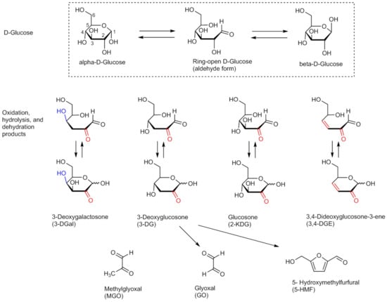 - Sigma-Aldrich. Taufkirchen (Germany), Safety Data Sheet. 3-Deoxyglucosone. Product Number 75762. 2019. Available online: https://www.sigmaaldrich.com/DE/de/sds/sigma/75762 (accessed on 27 October 2021).
