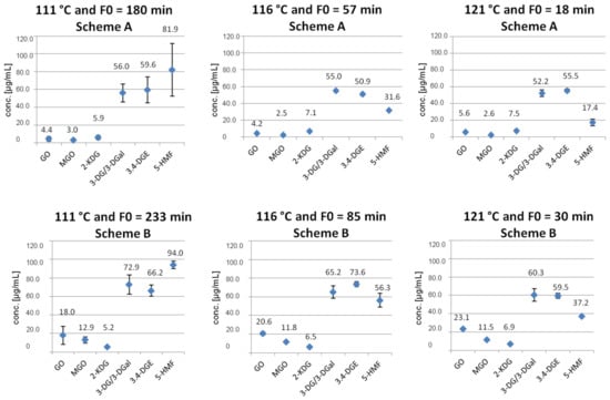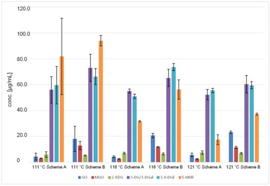 | Temp [°C] | GO [µg/mL] ± SD | MGO [µg/mL] ± SD | 2-KDG [µg/mL] ± SD | 3-DG/3-DGal [µg/mL] ± SD | 3,4-DGE [µg/mL] ± SD | 5-HMF [µg/mL] ± SD |