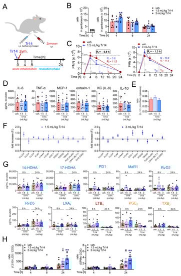 To study the effects of Tr14 on the inflammation-resolving mechanism in vivo, we employed the well-characterized acute inflammation model of zymosan-induced peritonitis in mice. Two different experimental settings were applied (see Section 4 and Figure S1 for more details): (1) Tr14 was given intraperitoneally (i.p.) at low (1.5 mL/kg) or high dose (3 mL/kg) once daily for six days prior to zymosan (i.p.) injection and peritoneal exudates were collected after 4, 8 and 24 h (Figure 1A); (2) Tr14 was given i.p. at low (1.5 mL/kg) or high dose (3 mL/kg) 4 and 8 h post-zymosan (i.p.) injection and peritoneal exudates were collected after 4, 8, 24, 192 and 360 h (Figure 2A).