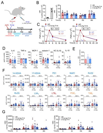 Effects of Tr14, administered i.p. 4 and 8 h post-induction of murine peritonitis, on resolution of inflammation and on lipid mediator pathways. (A–G) Self-resolving inflammation was initiated by injecting zymosan (0.1 mg/mouse, i.p.) into mice. Tr14 (1.5 mL/kg or 3 mL/kg) or vehicle (veh., 0.9% NaCl) were administered i.p. 4 and 8 h post-zymosan injection. Peritoneal exudates were collected after 4, 8, 24, 192 and 360 h (n = 6–8; outliers were removed) after zymosan injection, and from naïve untreated mice representing time point 0 h (n = 6). (A) Scheme of administration of Tr14 and induction of peritonitis. (B) Quantification of cell numbers in the peritoneal lavages, shown as single values and mean + SEM for the indicated time points. Left panel shows cell numbers in the peritoneum of naïve (untreated) mice at t = 0 and of zymosan-treated mice at t = 4 h. (C) Numbers of infiltrated PMNs (GR1+, F4/80−) in the peritoneal lavages, shown as mean + SEM at indicated time points. Resolution indices were defined, including Ψmax (maximal PMN counts), Tmax (time point when PMNs reach Ψmax), Ψ50 (50% PMN number reduction) T50 (time point corresponding to Ψ50) and Ri (resolution interval, the interval between Tmax and T50) according to [26]. (D) Cytokine/chemokine levels were measured 8 h post-zymosan injection and are given in pg/mL exudate as single values and mean + SEM. (E) Ratio of anti-inflammatory IL-10 versus pro-inflammatory cytokines/chemokines (sum of IL-6, TNF-α, MCP-1, eotaxin-1 plus KC (IL-8)) after 8 h of zymosan injection. (F) LM levels in exudates 24 and 360 h post-zymosan injection were analyzed by UPLC-MS-MS and are given in pg/mL exudate as single values and mean + SEM, * p < 0.05; ** p < 0.01; p values were calculated versus vehicle for each time point; unpaired one-way ANOVA with Dunnett´s multiple comparisons test. (G) Ratio of 12/15-LOX products (17-HDHA and 14-HDHA; left panel) and SPMs (LXA4, PD1, MaR1, RvD2 and RvD5; right panel) versus COX products (PGE2 and TXB2) 4, 8, 24, 192 and 360 h after zymosan injection. Results are shown as single values and mean + SEM.