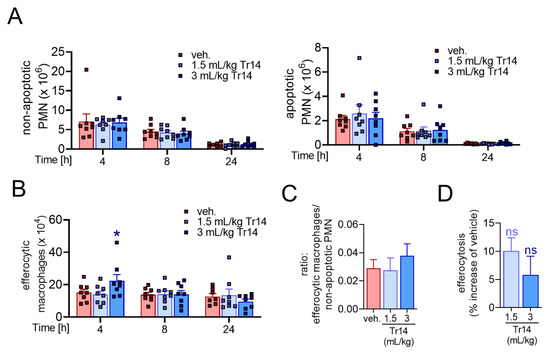Efferocytosis of apoptotic cells and cellular debris by recruited macrophages is an essential step in the resolution process that is strongly promoted by SPMs [6]. We investigated the effect of Tr14 administered i.p. once daily for six days prior to zymosan injection (experimental setting (1)) on macrophage efferocytotic functions in the murine peritonitis model (Figure S1). First, we assessed the total numbers of non-apoptotic and apoptotic PMNs after 4, 8 and 24 h in the exudates. Tr14 did not significantly change the numbers of apoptotic and non-apoptotic PMNs (Figure 3A). Next, we assessed the number of efferocytotic macrophages. Interestingly, Tr14 significantly enhanced the number of efferocytotic macrophages after 4 h (Figure 3B). The ratio of efferocytotic macrophages versus non-apoptotic PMNs was higher in Tr14-pre-treated mice after 4 h, which suggests acceleration of inflammation resolution (Figure 3C). Moreover, mice pretreated with Tr14 revealed a tendency towards enhanced capacity for PMN uptake by each efferocytotic macrophage versus cells from vehicle-treated animals (Figure 3D). Together, our data show that Tr14 enhances the formation of SPM and, arguably as a consequence, promotes the efferocytosis of apoptotic PMNs by macrophages in vivo during peritonitis in mice.
