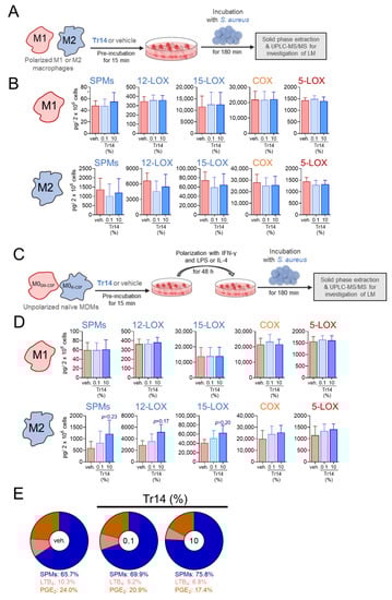 In contrast, when naïve MDMs were pre-treated with Tr14 for 15 min, then polarized towards M1- or M2-like phenotypes for 48 h, and subsequently challenged by S. aureus for LM formation, an enhanced formation of 15-LOX-1-mediated LM, especially SPMs, was observed in M2-MDM (Figure 4C,D and Figure S4B). As a result, Tr14 diminished the proportion of produced LTB4 and PGE2 versus SPMs (Figure 4E) suggesting that Tr14 shifts LM formation in M2-MDM towards a more pro-resolution profile during polarization of macrophages.