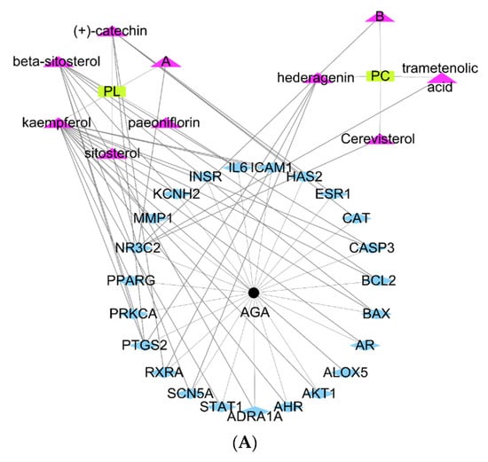 The network topology diagram of “Active-component-disease-target” showed interactions between active ingredients of PL and PC and AGA treatment (Figure 1A). In Figure 1A, interactions that involved 23 target genes are shown as blue rhombuses, AGA is represented as black dots, located in the middle of the target genes, and the active compounds of PC and PL are shown as pink triangles. PL and PC had six and four core active ingredients for AGA treatment, respectively.