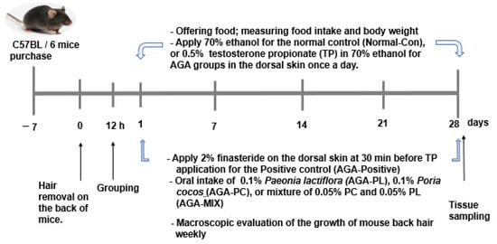 AGA-induced mice were divided into five treatment groups and assigned the following treatments: (1) 0.1% cellulose in diet (the AGA-Con group; control), (2) 0.1% lyophilized water extract of PL daily in diet (the AGA-PL group), (3) 0.1% lyophilized water extract of PC daily in diet (the AGA-PC group), (4) lyophilized water extracts of 0.05% PL plus 0.05% PC (the AGA-MIX group) daily in a high-fat diet (HFD), or (5) 2 mg finasteride daily application to backs plus 0.1% cellulose in diet (the AGA-Positive group). A total of 2 mg finasteride was used on the back of the AGA-positive mice by applying 100 μL of 2% finasteride solution (2 mg) in 70% ethanol daily. Normal control mice without AGA induction were fed 0.1% cellulose supplementation in HFD (Normal-Con). Mice in each group consumed the designated diet for 28 days. The HFD contained 43% fat (lard and corn oil = 10:1) and 0.5% cholesterol, and 0.1% of the designated herbal extracts or cellulose were added into the HFD. The diets in all groups had equivalent energy and nutrient contents, and control diets contained cellulose, which did not affect AGA symptoms, instead of PL or PC. Food and water were provided ad libitum. Food intakes, body weights, and hair growth statuses were measured weekly.