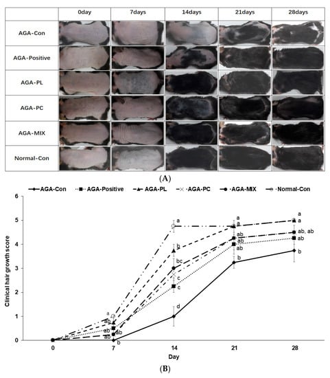 On experimental day 7, as many new hairs were visible in the AGA-PL group as the Normal-Con group (Figure 3A). On experimental day 14, PL and PC ingestion was associated with fast hair growth, but hair growth was just initiated in the AGA-Con group. At this time, hair growth in the AGA-Con was observed on less than 20% of the exposed dorsal skin but more than 20% in the AGA-Positive and AGA-PC groups, and more than 80% in the AGA-PL, AGA-MIX, and Normal-Con groups (Figure 3A,B). On experimental day 21, exposed skin was visible in the AGA-Con group, while dorsal skin was completely covered with as much hair in the AGA-PL group as in the Normal-Con group, but slightly exposed in the AGA-Positive, AGA-MIX, and AGA-PC groups (Figure 3A,B). On experimental day 28, most dorsal skin tissues were still exposed in the AGA-Con group, partially exposed in the AGA-PC group, slightly exposed in the AGA-Positive and AGA-MIX groups, and completely covered in the AGA-PL and the Normal-Con groups (p < 0.05) (Figure 3A,B). Overall, mice in the AGA-PL and AGA-MIX groups exhibited faster skin hair growth than those in the AGA-Con group (p < 0.05).