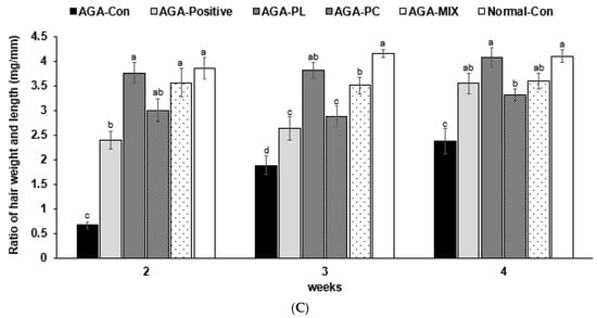 The result of the 1st week was not added to Figure 3C, since the hair on the back did not grow in any group. In the 2nd week, the ratio of hair length and weight was significantly higher in the treatment groups than in the AGA-Con group, and the ratio of the AGA-PL and AGA-MIX groups was similar to that of Normal-Con (p < 0.05; Figure 3C). In the 3rd and 4th weeks, the hair length ratio with weight was higher in the treatment groups than that of the AGA-Con group. AGA-PL increased the ratio as much as the Normal-Con (p < 0.05; Figure 3C). PL and PL and PC mixture ingestion was associated with complete hair growth in AGA mice during the 8-week treatment.