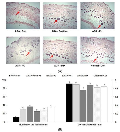 Histological differences and hair follicle densities in dorsal skins. (A) Histology of H&E-stained dorsal skins. (B) The red arrows indicate the hair follicle. AGA was induced with the application of 0.5% testosterone propionate solution on the back of mice, and AGA-induced mice orally consumed 0.1% PL, 0.1% PC, or 0.1% mixture of PL and PC (1:1, w/w) in a 43% fat diet (HFD), called AGA-PL, AGA-PC, or AGA-MIX groups, respectively. AGA-induced mice were daily applied with 2% finasteride on the back, as AGA-Positive (positive control). AGA-Positive and AGA-Con (control) mice had 0.1% cellulose (no effective activity in AGA treatment) in HFD. Normal-Con did not induce AGA and consumed 0.1% cellulose in HFD. All mice had an 8-week treatment. After 28 days of treatment, dorsal skins were fixed with 10% formaldehyde, embedded in paraffin, sectioned, and stained with hematoxylin and eosin. Original magnification 100×. Bars and error bars are mean ± standard deviations (N = 11 or 12). a,b,c Different letters on the bars indicate a significant difference as per a Tukey test at p < 0.05, and no or the same letters indicate no significance between the groups.