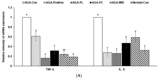 After the intervention, the mRNA expressions of tumor necrosis factor-α (TNF-α) and interleukin 6 (IL-6) cytokines in dorsal skin tissues were much higher in the AGA-Con group than in the Normal-Con group (Figure 5A), but similar in the AGA-PL and Normal-Con groups, and also reduced in the AGA-PC and AGA-MIX groups, but not as much as that observed in the AGA-PL group. Their expressions were also reduced in the AGA-Positive group compared with AGA-Con, but the decrease of IL-6 mRNA expression was much more significant than that of TNF-α (Figure 5A).