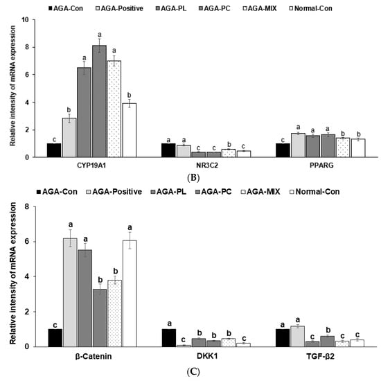 mRNA expression levels in the dorsal skin. (A) Tumor necrosis factor-α (TNF-α) and interleukin 6 (IL-6). (B) Aromatase (CYP19A1), nuclear receptor subfamily 3 group (NR3C2), and peroxisome proliferator-activated receptor gamma (PPARG). (C) β-Catenin, Dickkopf-related protein 1 (DKK1), and tumor growth factor-β2 (TGF-β2). Bars and error bars are mean ± standard deviations (N = 4). a,b,c Different letters on the bars indicate a significant difference as per a Tukey test at p < 0.05, and no or the same letters indicate no significance between the groups. AGA was induced with the application of 0.5% testosterone propionate solution on the back of mice, and AGA-induced mice orally consumed 0.1% PL, 0.1% PC, or 0.1% mixture of PL and PC (1:1, w/w) in a 43% fat diet (HFD), called AGA-PL, AGA-PC, or AGA-MIX groups, respectively. AGA-induced mice were daily applied with 2% finasteride on the back, as AGA-Positive (positive control). AGA-Positive and AGA-Con (control) mice had 0.1% cellulose (no effective activity in AGA treatment) in an HFD. Normal-Con did not induce AGA and consumed 0.1% cellulose in an HFD. All mice had an 8-week treatment.