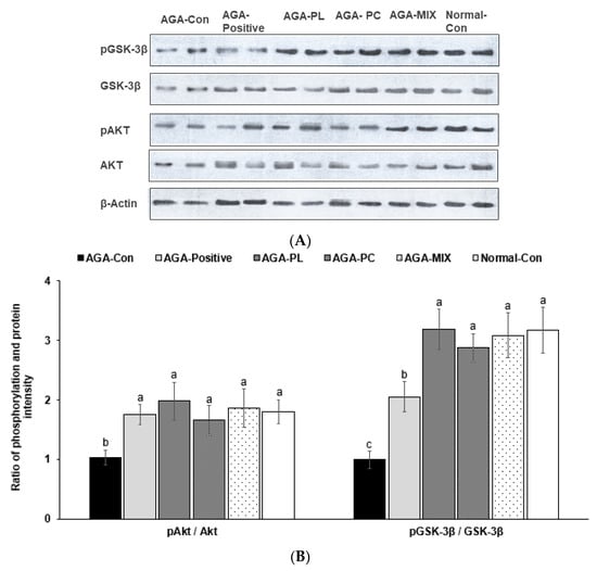 Phosphorylation of Akt and GSK-3β in the dorsal skin. (A) The phosphorylation and protein contents of Akt and glycogen-synthase kinase-3β (GSK-3β). (B) The ratio of the phosphorylation and protein of Akt and GSK-3β. Bars and error bars are mean ± standard deviations (N = 4). a,b,c Different letters on the bars indicate a significant difference as per a Tukey test at p < 0.05, and no or the same letters indicate no significance between the groups. The insulin signaling pathways were measured with western blotting analysis, and an image analyzer measured their intensity. AGA was induced with the application of 0.5% testosterone propionate solution on the back of mice, and AGA-induced mice orally consumed 0.1% PL, 0.1% PC, or 0.1% mixture of PL and PC (1:1, w/w) in a 43% fat diet (HFD), called AGA-PL, AGA-PC, or AGA-MIX groups, respectively. AGA-induced mice were daily applied with 2% finasteride on the back, as AGA-Positive (positive control). AGA-Positive and AGA-Con (control) mice had 0.1% cellulose (no effective activity in AGA treatment) in an HFD. Normal-Con did not induce AGA and consumed 0.1% cellulose in an HFD. All mice had an 8-week treatment.