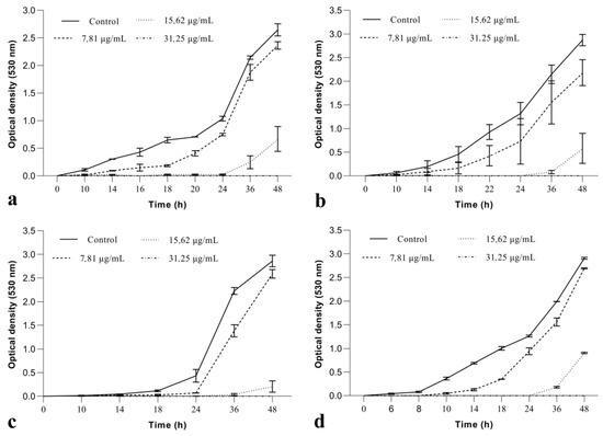 Growth kinetics of Candida spp. treated with BrCl-flav at different concentrations: (a) C. albicans; (b) C. krusei; (c) C. parapsilosis; (d) C. glabrata. Bars indicate standard deviations (p < 0.05).