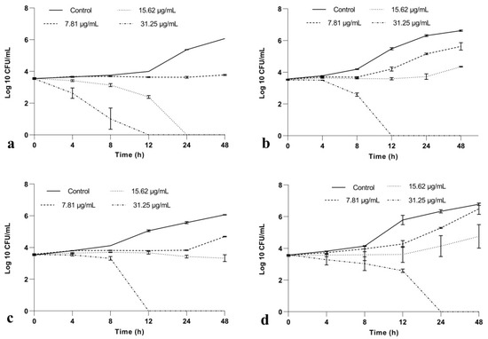 Time-kill curves after BrCl-flav exposure at different concentrations: (a) C. albicans; (b) C. krusei; (c) C. parapsilosis; (d) C. glabrata. Bars indicate standard deviations (p < 0.05).