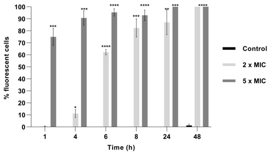 Effect of BrCl-flav on Candida albicans cell membrane structure. Cells were treated with concentrations of BrCl-flav equivalent to 2 × MIC and 5 × MIC and stained with propidium iodide. Bars indicate standard deviations. Asterisk represents a significant difference (p < 0.05) vs. Control (* = p < 0.0476; ** = p < 0.0019; *** = p < 0.0008; **** = p < 0.0001).