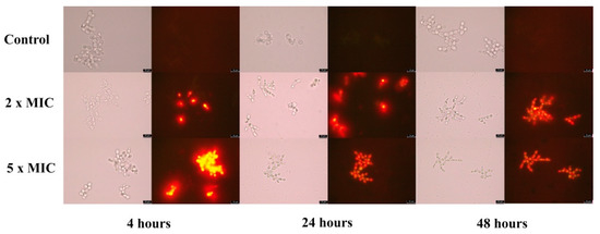 Effect of the BrCl-flav exposure on membrane permeability of Candida albicans exponential-phase cells to propidium iodide. Red fluorescence cells were detected in samples using fluorescence microscopy after 4, 24 and 48 h of incubation with BrCl-flav (concentrations equivalent to 2 × MIC and 5 × MIC); magnification 1000×.