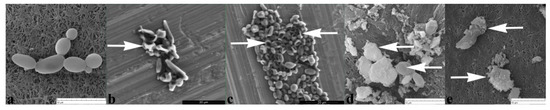 SEM photomicrographs showing the effects of BrCl-flav on Candida albicans cell morphology: (a) control; (b) cells exposed 6 h to MIC; (c) cells exposed 6 h to 2 × MIC; (d) cells exposed 6 h to 5 × MIC; (e) cellular debris. Arrows indicate irreversible morphological damage of treated fungal cells. These scanning electron photomicrographs are representative of a typical result.