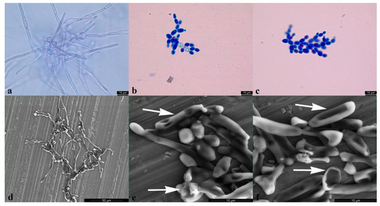 BrCl-flav inhibition of C. albicans hyphal formation in liquid RPMI 1640 (6 h at 37 °C): control cells (a,d); cell exposed to BrCl-flav at concentrations equivalent to MIC (b,e) and 2 × MIC (c,f); control cells formed hyphae (a,d); hyphae formation was inhibited by BrCl-flav at MIC (e); yeast to hyphal transition was prevented by BrCl-Flav at 2 × MIC equivalent concentration (c,f); treated cells appeared colored in blue when a methylene blue staining was performed to distinguish between live and dead cells (b,c) and showed significant morphological damages (e,f). Arrows indicate irreversible morphological damage of treated fungal cells. Images were obtained using a light microscope, magnification 1000× (a–c) and SEM (d–f).