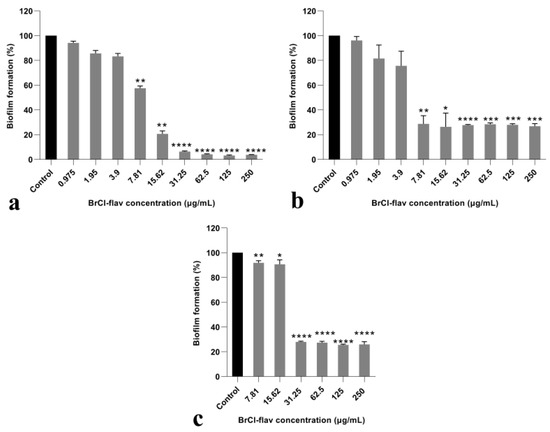 In vitro activities of BrCl-flav against Candida spp. biofilm formation: (a) C. albicans; (b) C. krusei; (c) C. glabrata. Bars indicate standard deviations. Asterisk represents a significant difference (p < 0.05) vs. Control (* = p < 0.0435; ** = p < 0.0088; *** = p < 0.0009; **** = p <0.0001).