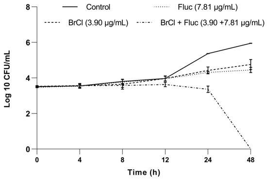 A combination of BrCl-flav and fluconazole (3.9/7.81 µg/mL) was further selected to study the synergistic effect over time, using a time-kill assay. No reduction in the number of viable Candida albicans cells was recorded for BrCl-flav and fluconazole used alone, compared with the control. However, when used in combination, the two tested antifungal agents showed a significant fungicidal activity (p < 0.0012), with total kill after 48 h (Figure 8).