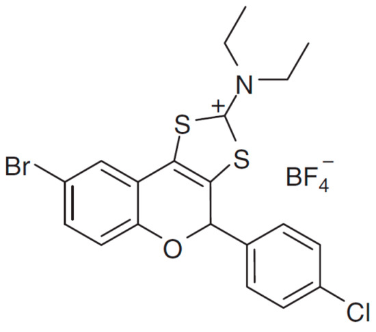 Tricyclic flavonoid BrCl-flav (Figure 9) was obtained as previously described [26]. The structure and purity (>99%) of the final compound have been established by NMR, MS, IR and elemental analysis. UV-Vis spectroscopy was employed to monitor the stability of BrCl-flav towards Sabouraud dextrose broth (SDB, Carl Roth, Karlsruhe, Germany), RPMI 1640 (Carl Roth) and phosphate buffer saline (PBS). The tricyclic flavonoid proved to be stable over a time span equivalent to the performed tests.