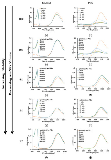 One of the most important parameters in using nanomaterials for biological application is their stability in biological medium. For this study, two common media were used, namely, DMEM culture medium and PBS at pH 7.4. Gelatin@Au-NRs at different volumetric ratios were added to both media at 37 °C, and their stability over time was monitored using a UV-Vis-NIR spectrophotometer. The changes in LSPR absorbance and wavelength were used to explain the stability [11]. When CTAB-capped Au-NRs were dispersed in a culture DMEM medium, it immediately showed a blue shifting in its LSPR position with a reduction in absorbance within the first minute (Figure 1a). Then, it became stable onwards with no significant changes.