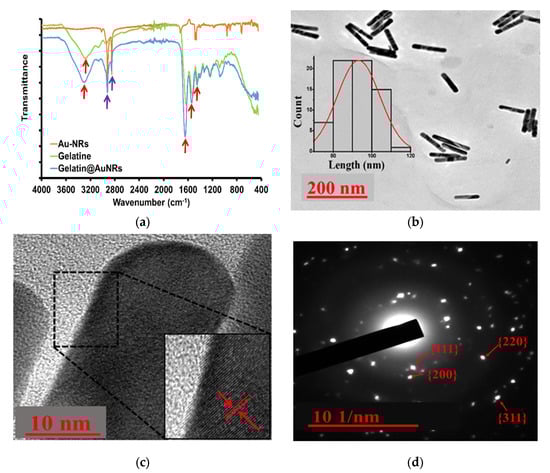 (a) FTIR, (b)TEM image with corresponding length distribution histogram, (c) HRTEM and (d) SAED of gelatin@Au-NRs.